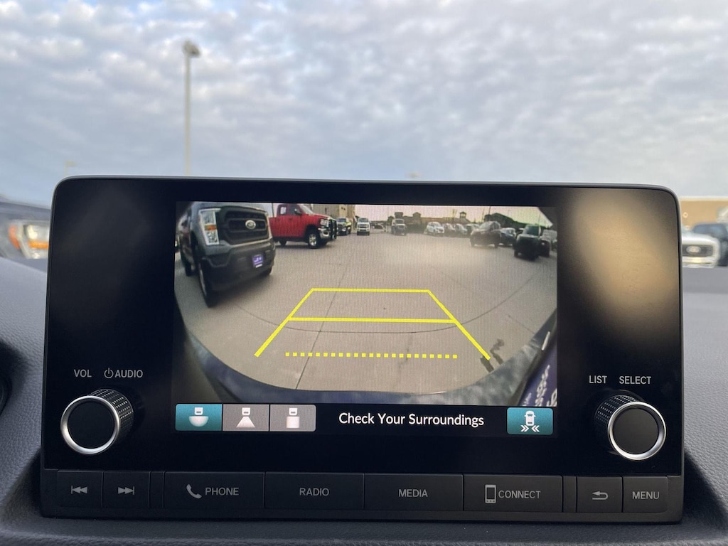 • The vehicle is equipped with a camera that displays an image of the area behind the vehicle on an interior display.